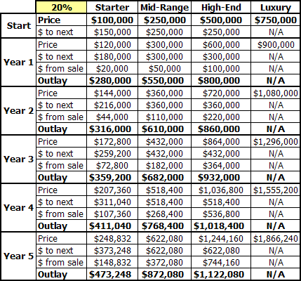 As you can see, although the starter home is gains a decent amount of value every year, the higher value homes' increase in cost even faster. The homebuyer that stretches to get into the "starter home" will be essentially stuck in their home, in no better a position to "trade up" than an individual that chooses to rent for half the cost.